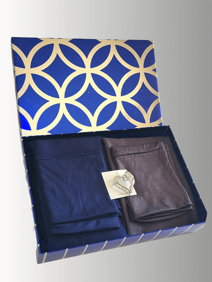 Elevate your hijab collection with this cool-toned beauty. The Indigo Mist and Charcoal Veil pairing offers a balance of deep elegance and neutral charm. Packaged in a stunning blue and silver gift box, this set includes a graceful pearl heart brooch for a feminine, timeless touch.